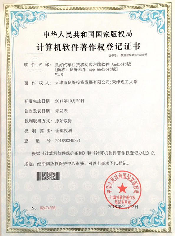 爱游戏ayx官方网页联合天津理工大学共同研发的“良好汽车租赁移动客户端软件”(简称:良好租车app Android版),近日通过中国版权保护中心审核、登记,获得由中国国家版权局颁发的《计算机软件著作权登记证书》。该证书的取得,标志公司在互联网出行领域“平台与数据研发建设方面”取得重大的成绩。